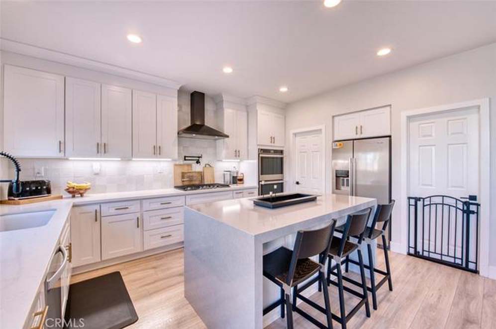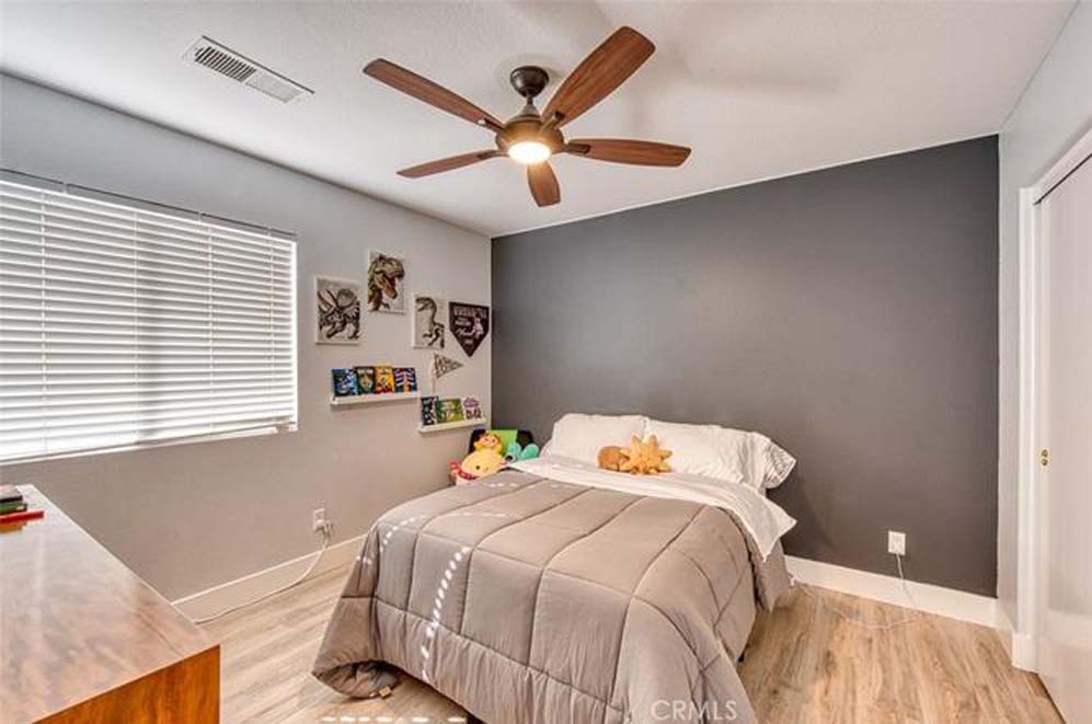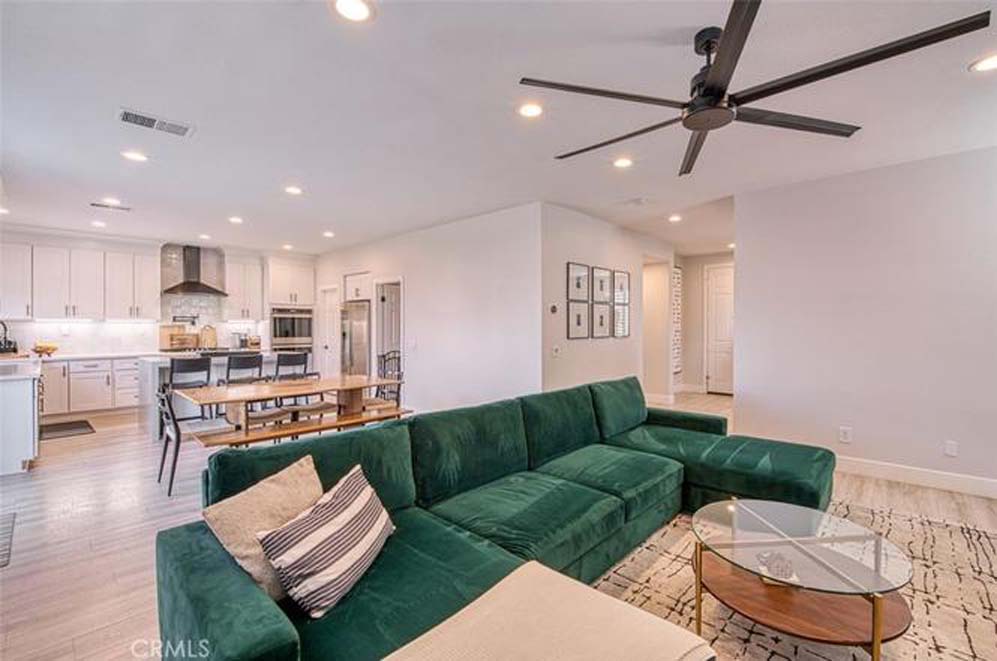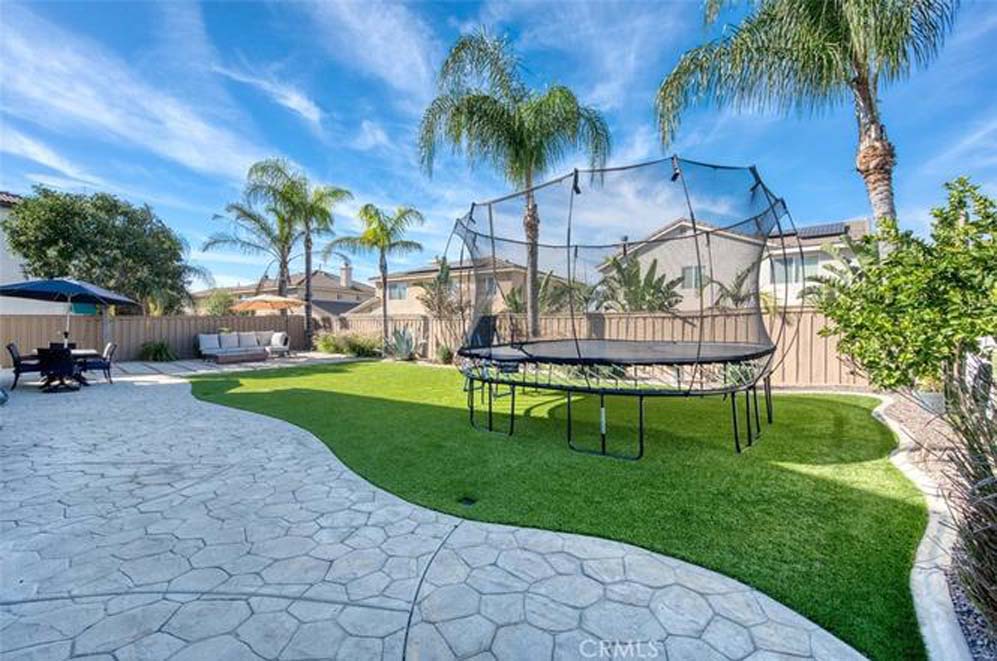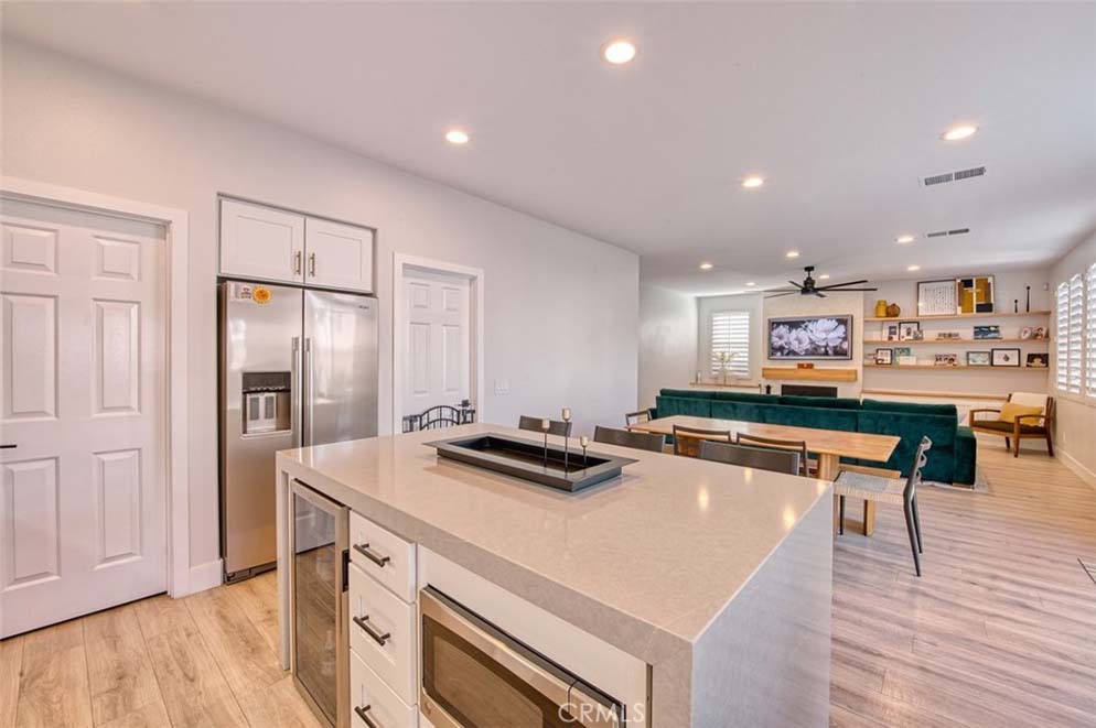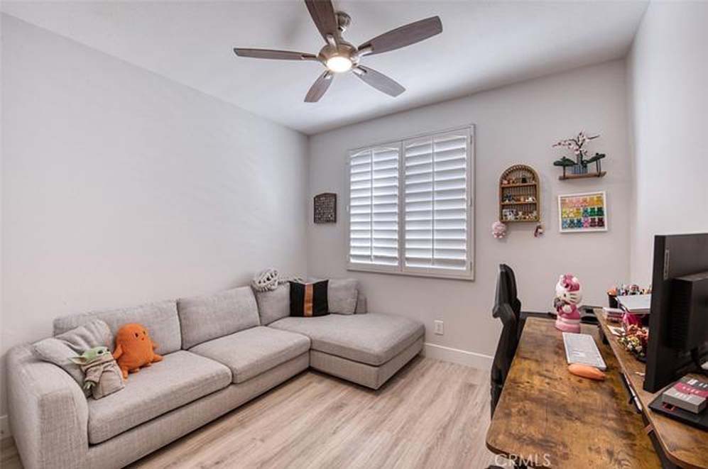 MOVE-IN READY EASTVALE HOME! Gorgeous two-story home offering 2,253 square feet of living space, featuring 4 bedrooms and 3 full bathrooms, thoughtfully designed for comfort and functionality. The entry welcomes you with a downstairs bedroom and full bathroom with walk-in shower, ideal for guests or multigenerational living. Across the hall is a versatile flex room, perfect as a den, home office, or playroom. Enjoy an open-concept floor plan enhanced by wood grained water-resistant vinyl flooring throughout the main living areas. The spacious family room features a cozy fireplace and flows seamlessly into the dining area and stunning, fully updated kitchen. The chef’s kitchen boasts stainless steel appliances, double ovens, a 5-burner cooktop with range hood, wall-mounted pot filler, quartz countertops with matching backsplash, stylish cabinetry, a large island with Silestone countertop, and a walk-in pantry. Refrigerator and beverage refrigerator are included. Additional highlights include plantation shutters, abundant recessed lighting, and a whole house water softener system for enhanced comfort and appliance longevity. Upstairs, the primary suite offers a relaxing retreat with dual sinks, a soaking tub, separate shower, and a walk-in closet with built-in organizers. A hall bathroom with dual sinks and two additional bedrooms complete the upper level. The 2-car garage features custom built-in cabinetry for excellent storage. Energy efficiency is enhanced with a solar power system. Step outside to a spacious backyard with artificial turf and attractive landscaping, perfect for entertaining or low-maintenance outdoor living. The home is conveniently located within walking distance to Harada Elementary School and Harada Heritage Park, and just minutes from shopping, dining, and entertainment.